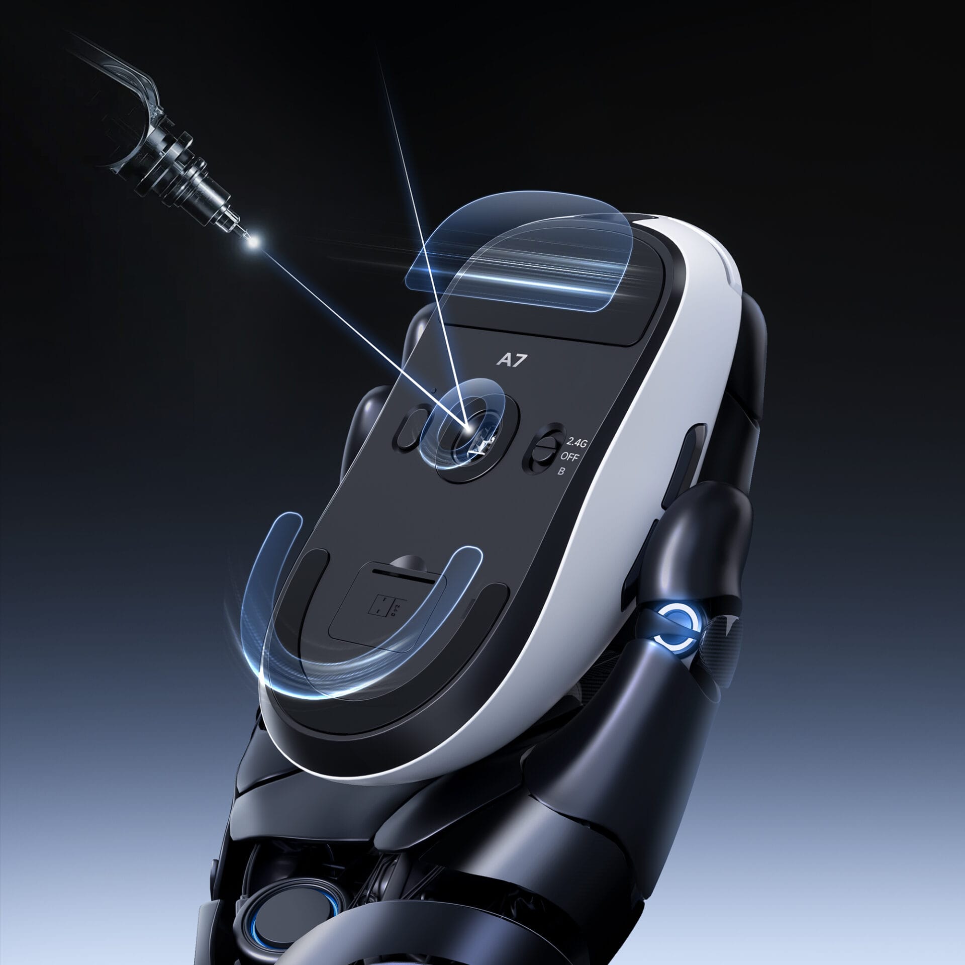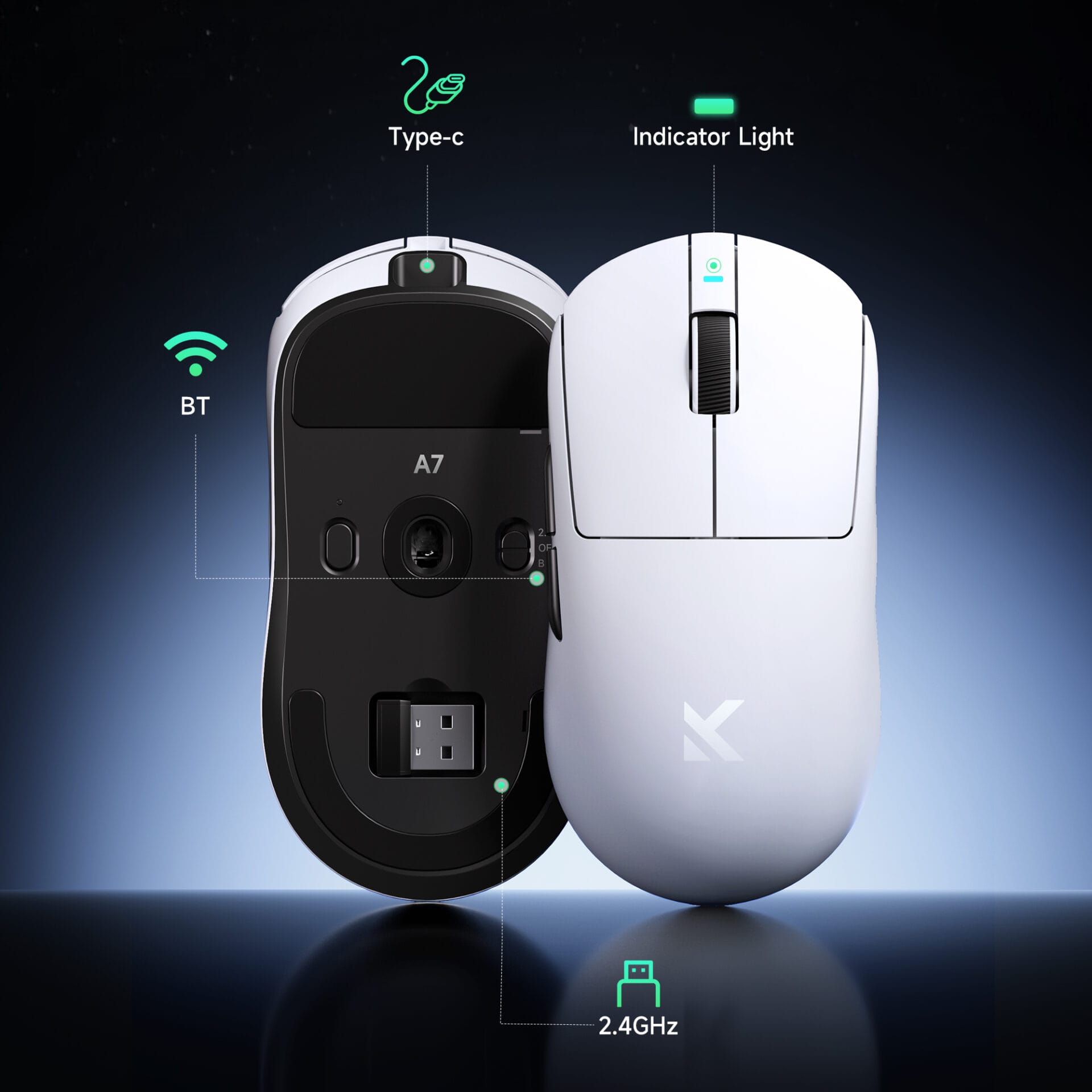 Suporta conectividade Tri-Mode: cabo USB-C, wireless 2.4GHz e Bluetooth. O A7 oferece 1.000Hz com fio e até 8.000Hz em wireless (requer recetor 8K vendido à parte).